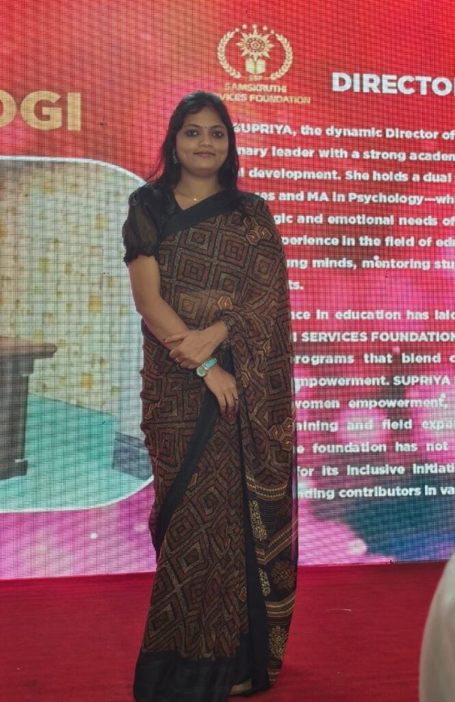 Ms. Supriya, the dynamic Director of Samskruthi Services Foundation, is a visionary leader with a strong academic background and a deep commitment to social development. She holds a dual postgraduate qualification—MBA in Human Resources and MA in Psychology—which uniquely equips her to understand both the strategic and emotional needs of individuals and communities.